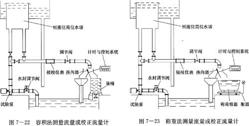 1)容積法:由量筒、切換器、計時器等組成,如圖7-22所示。量筒應有足夠大容積,在測定時液體不應溢出量筒外面。確定量筒高度時,應使量筒內有500 mm以上的水位差,橫截面應上下一致,充滿液體以后,不應發生變形,量筒的測量不確定度應小于±0.3%。