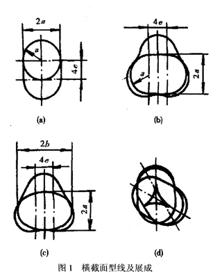 定子截形的形成如圖I(d)圳所示。如前述卡丹諾圓運動,滾動半徑為1.5 e,以e為半徑的圓上一點運動軌跡謂之骨線(圖2的三棱狀內擺線K)。轉子運動時,其對稱軸線4 9問線段與骨線共軛,運動過程中轉子外廓的展成線即為定子型線。雖運動軌跡相同,由于轉子截形不同,所展成的定子型線差異甚大,B型為三瓣花形C型為類三角形。其節距丁=1.5 t,三頭。轉子頭數與定子頭數之比為23。