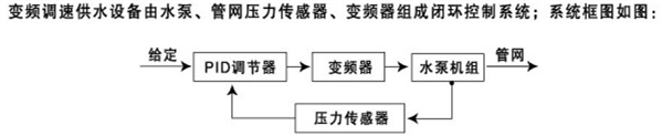 變頻恒壓供水設備由水泵、管網壓力傳感器、變頻器組成閉環控制系統;系統框圖: